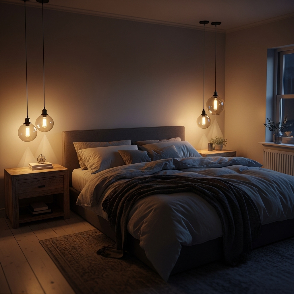 Pendant lights with warm bulbs help highlight certain areas of the room while adding design flair. Use them above nightstands for added comfort and style.
