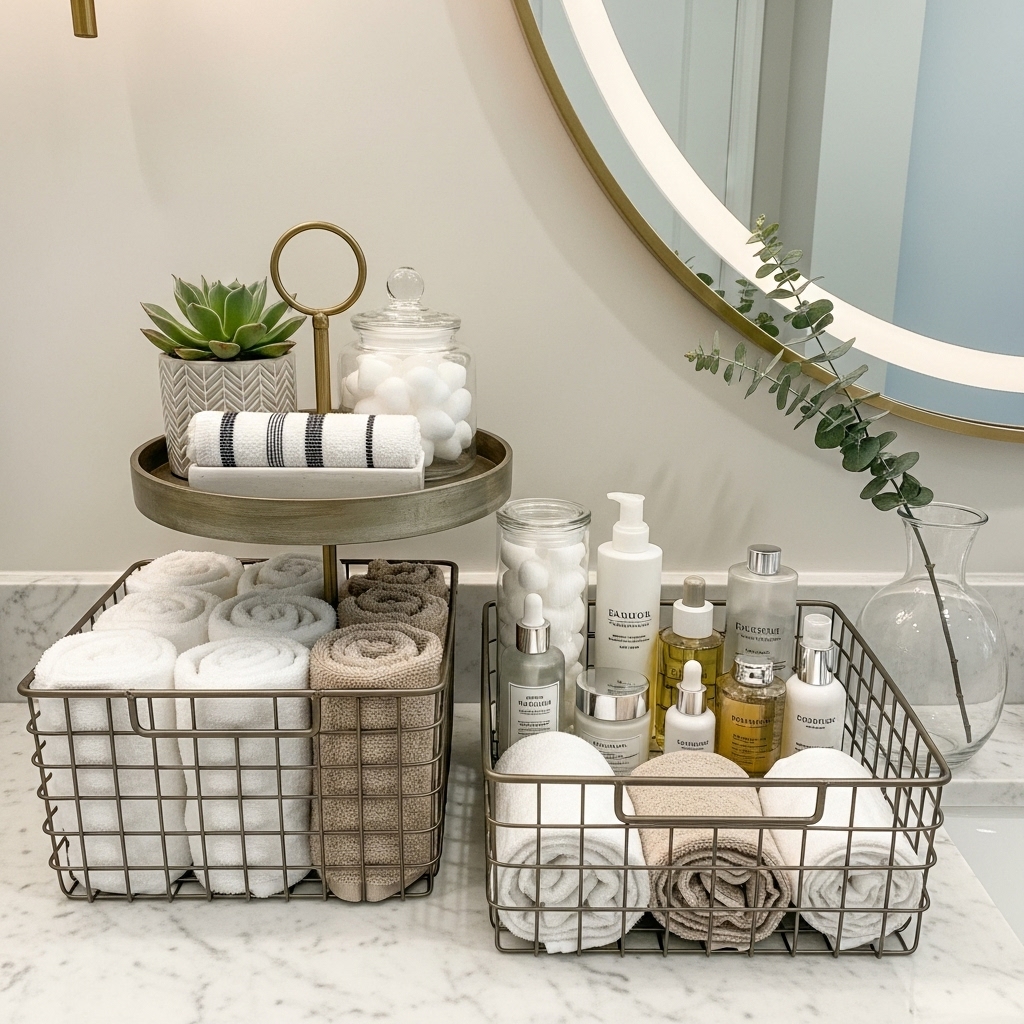 Use trays, wire baskets, or tiered stands for everyday essentials. Open storage looks intentional and chic if kept neat.