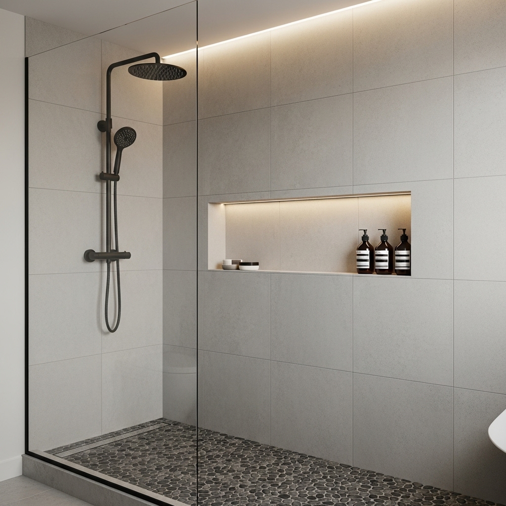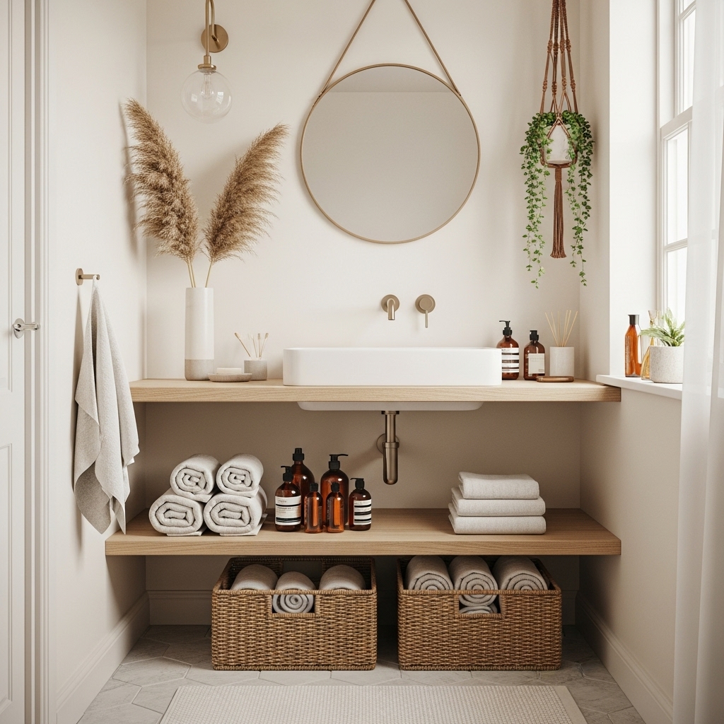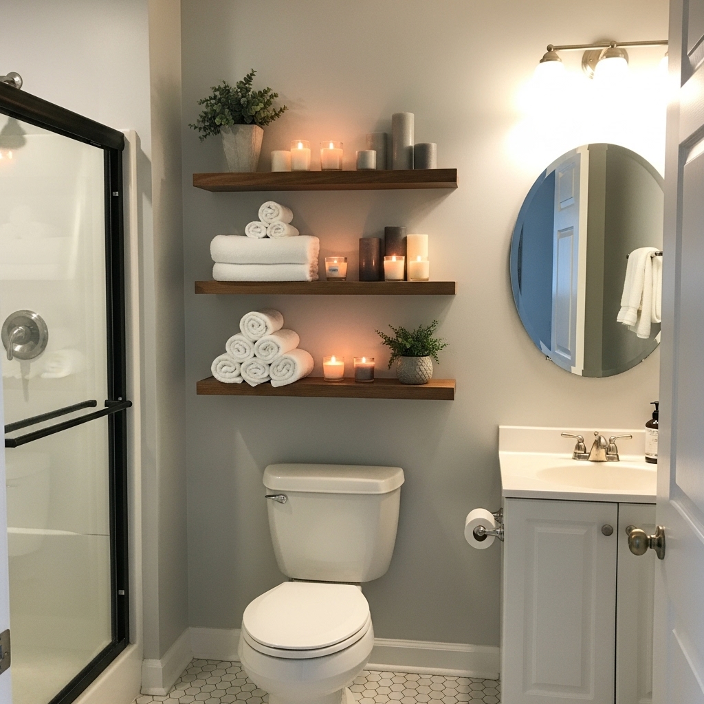 Short on counter space? Floating shelves above the toilet or next to the sink are perfect for both storage and décor. Add baskets, small plants, or rolled-up towels for a spa-like vibe.
