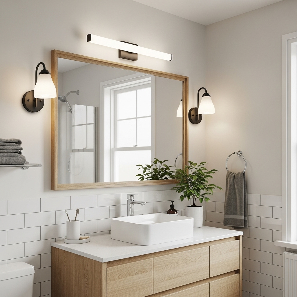 If your bathroom has the dreaded harsh lighting, consider plug-in wall sconces or stick-on LED vanity lights. Better lighting = better vibes (and better selfies).