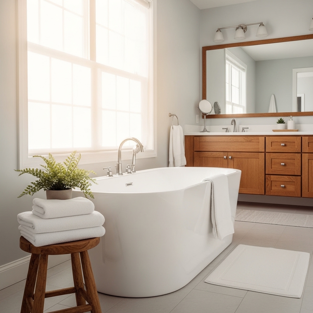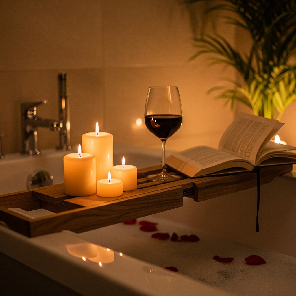 Want instant spa vibes? Add a wooden bath tray across your tub. Perfect for candles, books, or even a glass of wine (no judgment 😉).