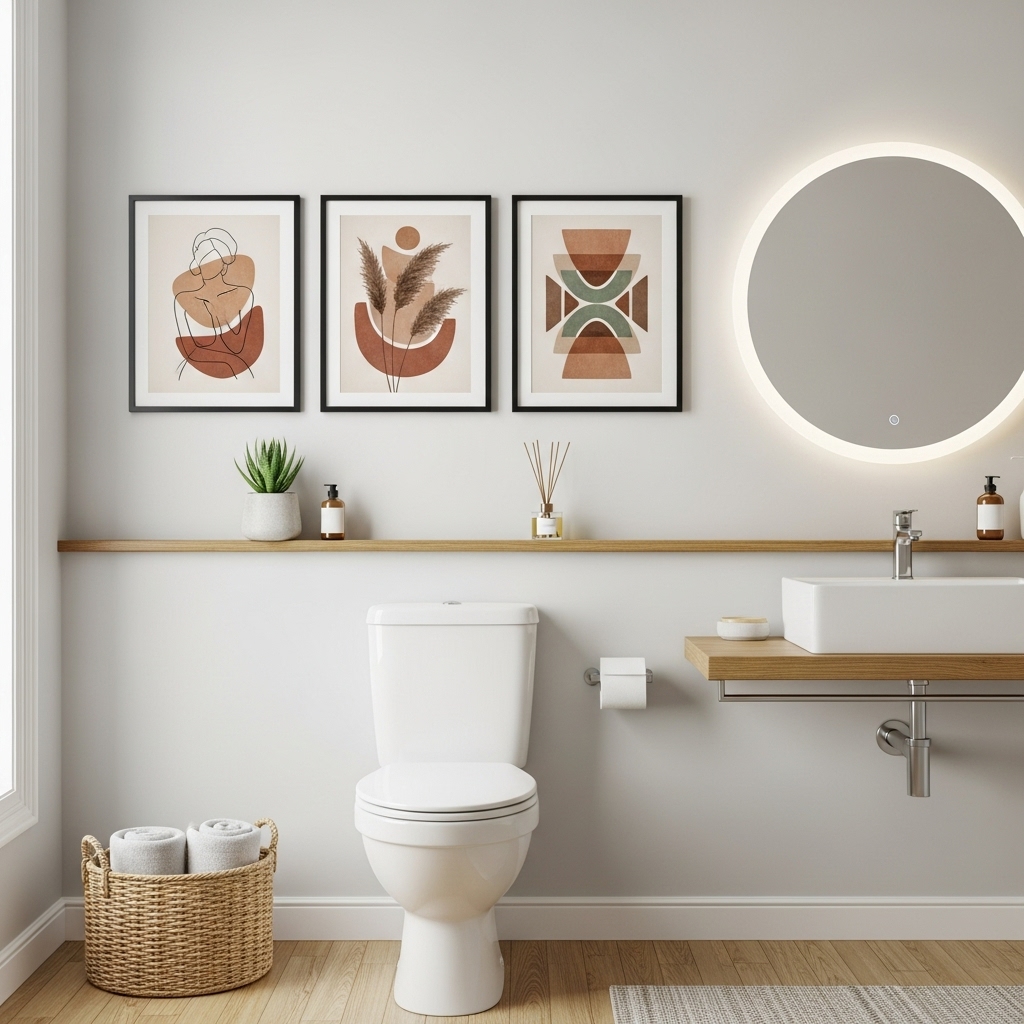 Why should your bathroom walls be bare? Add framed art prints or quirky wall hangings to give the space personality. Even a gallery wall can work in small bathrooms if you keep frames lightweight.