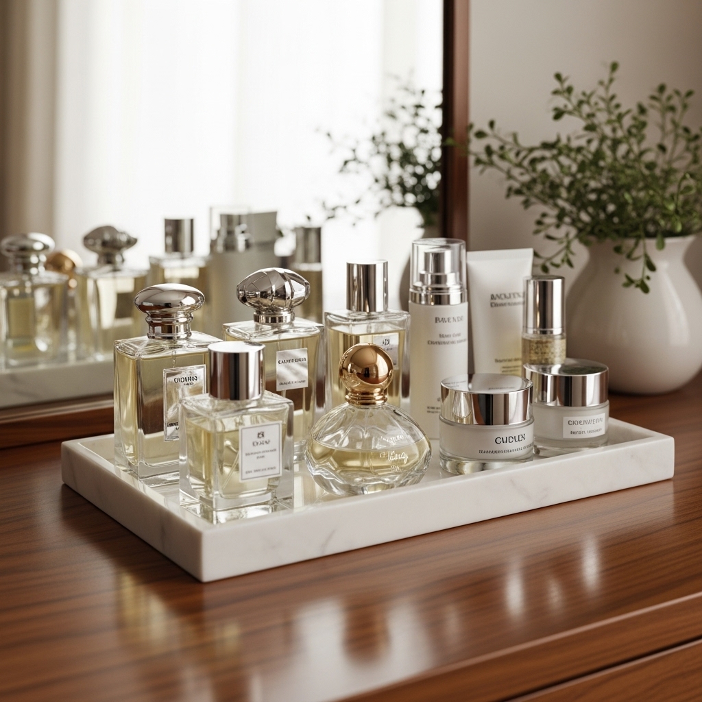 Line up your prettiest bottles and jars on a tray. Functional items can double as décor, especially when organized thoughtfully.