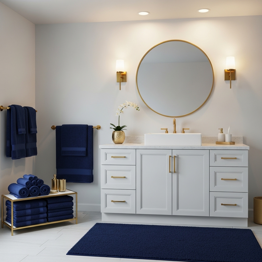 Pick one bold color—like emerald green, navy, or blush—and incorporate it through towels, rugs, and accessories for a cohesive theme.