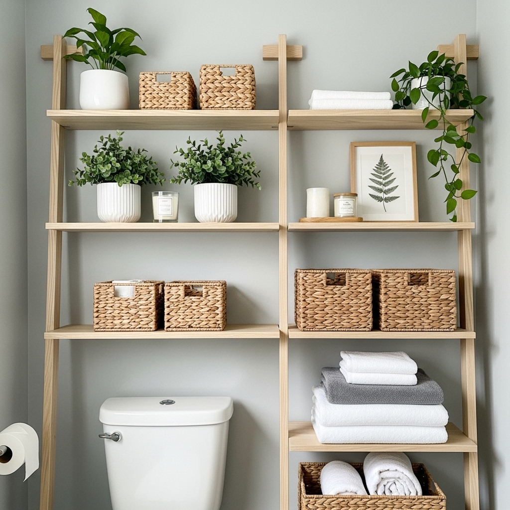 That awkward space above the toilet? Prime real estate! Try ladder shelves or slim cabinets to add stylish storage.