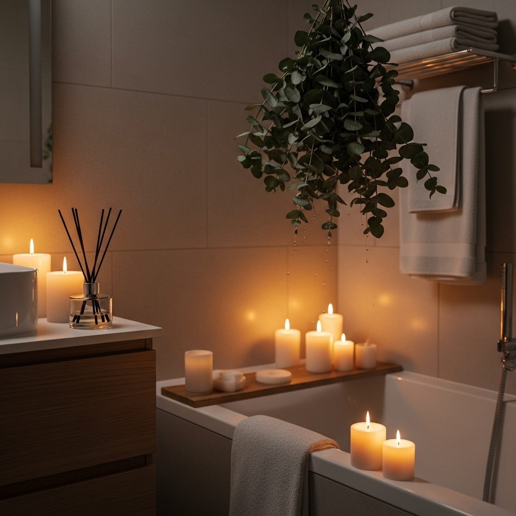 Candles, diffusers, or even eucalyptus hung on the showerhead can make your bathroom smell as good as it looks.