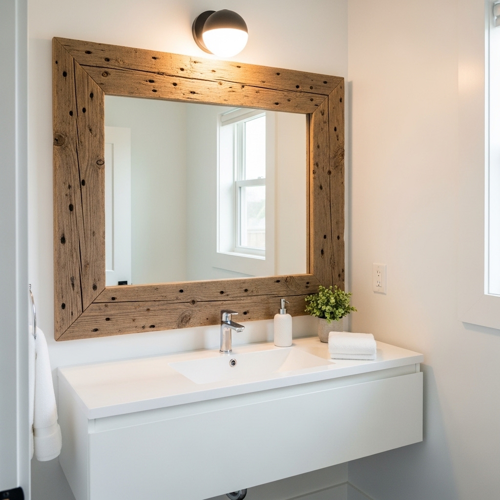 If replacing your mirror isn’t an option, try mirror framing kits or DIY wood frames. It instantly gives a builder-grade mirror a designer upgrade.