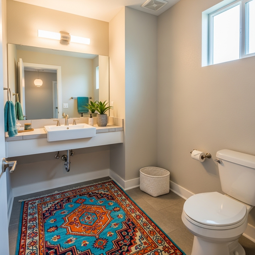 Swap out your old bath mat for a colorful patterned rug. It’ll ground the space and make it feel homey instead of sterile.