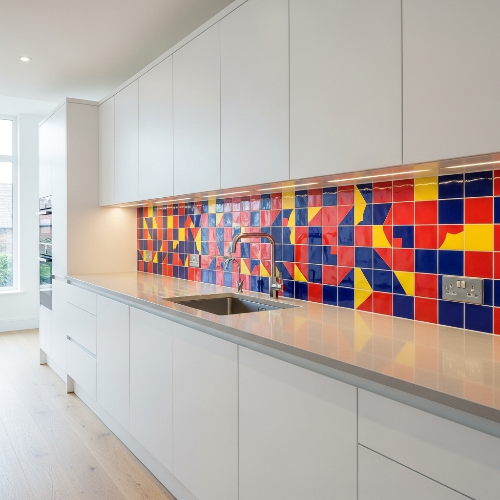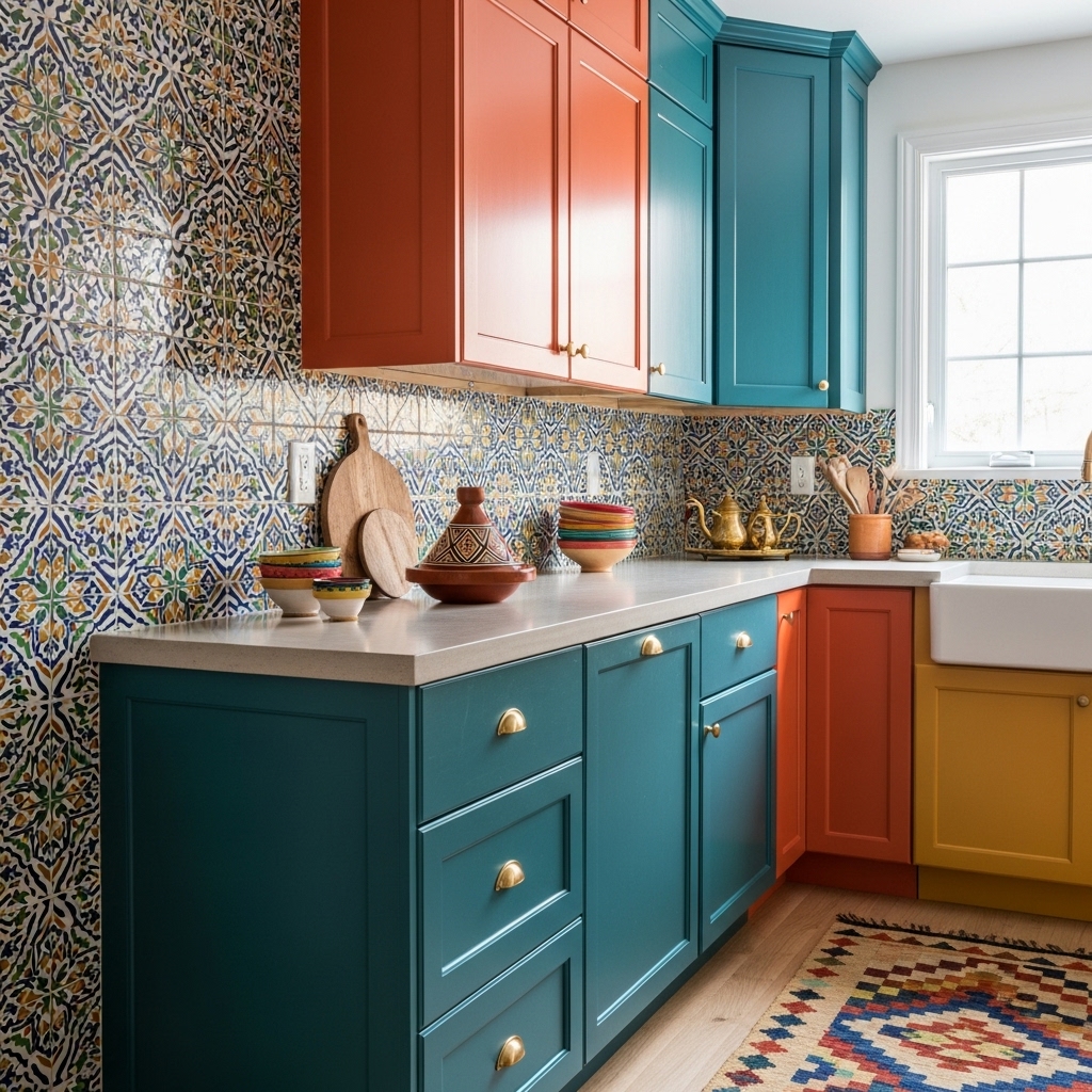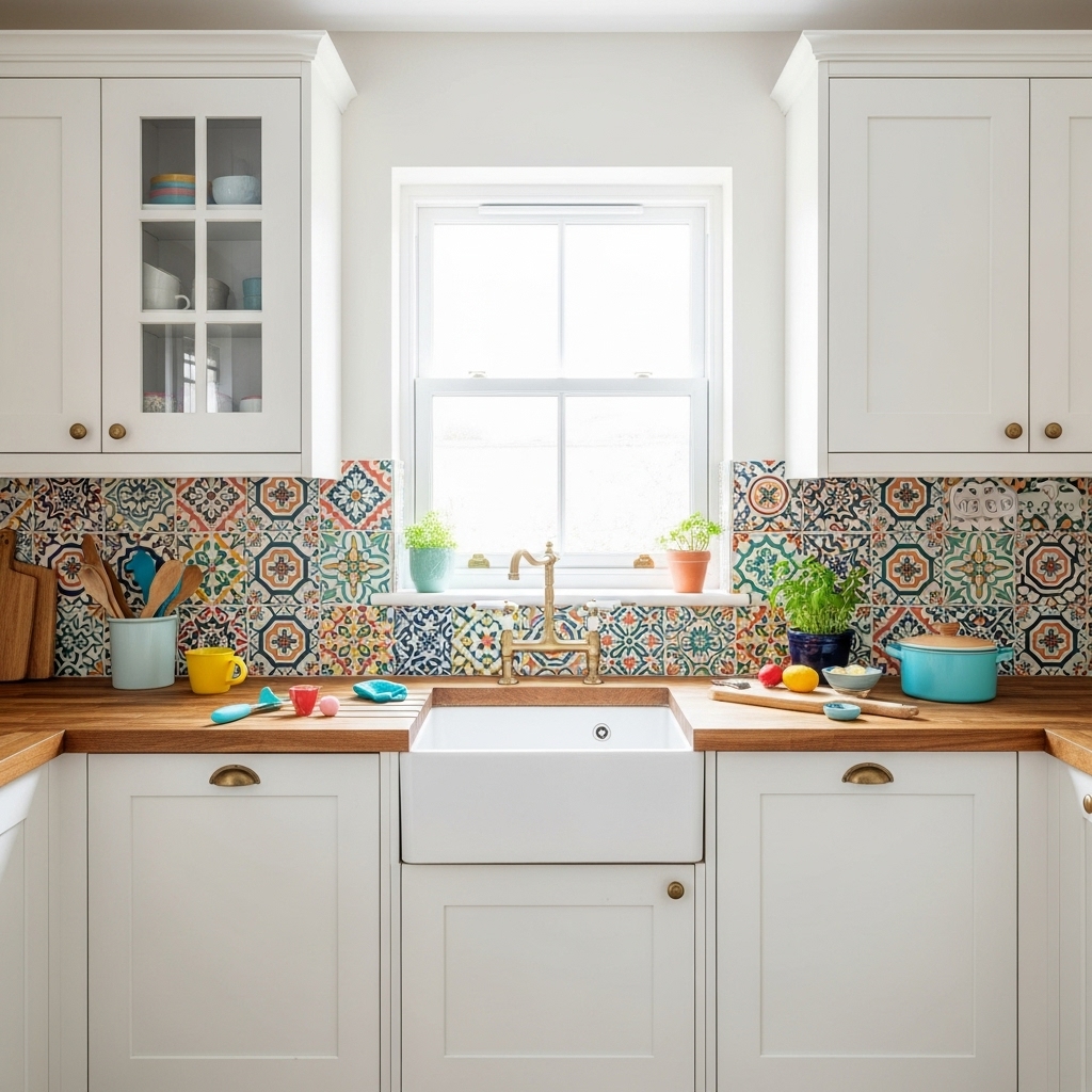 Encaustic tiles with bold colors and intricate patterns bring a lively, artistic touch to your kitchen. These tiles are perfect for adding personality and can serve as the focal point of your design.