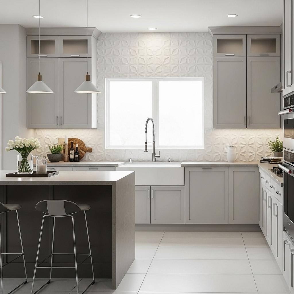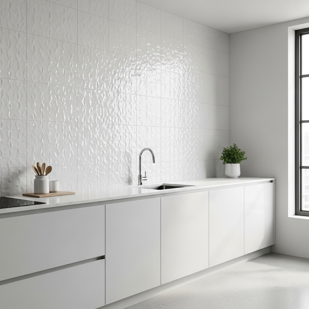 For a clean and airy kitchen, a white-on-white backsplash with subtle texture is perfect. It keeps your space bright and allows your cabinets and countertops to shine.