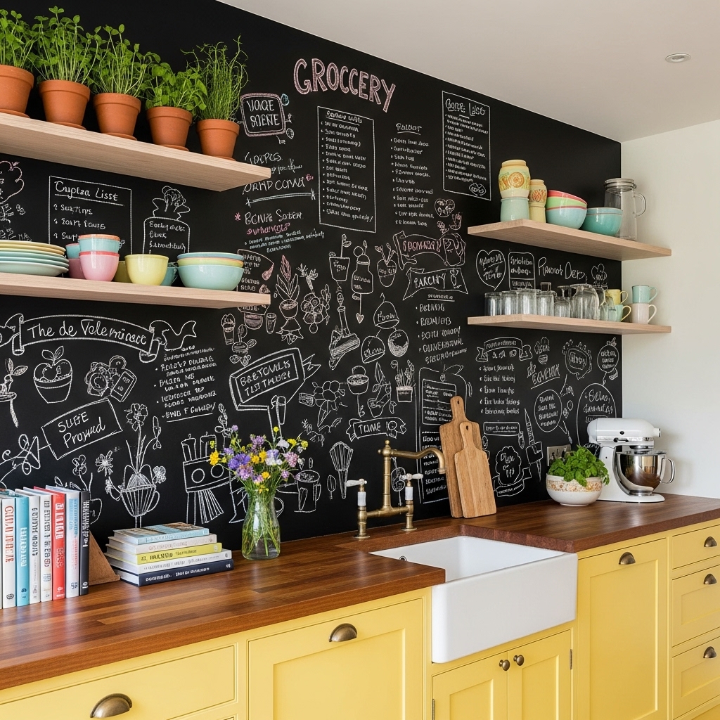 A fun and functional idea is a chalkboard backsplash. Perfect for family kitchens, it allows you to jot down recipes, grocery lists, or inspirational messages while adding a creative touch.