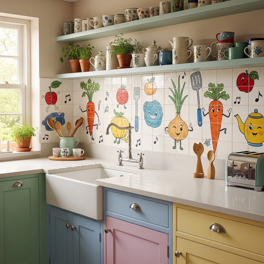 For a truly unique backsplash, hand-painted tiles bring artistry into your kitchen. Each tile can feature a small piece of a larger design or stand alone with whimsical illustrations.