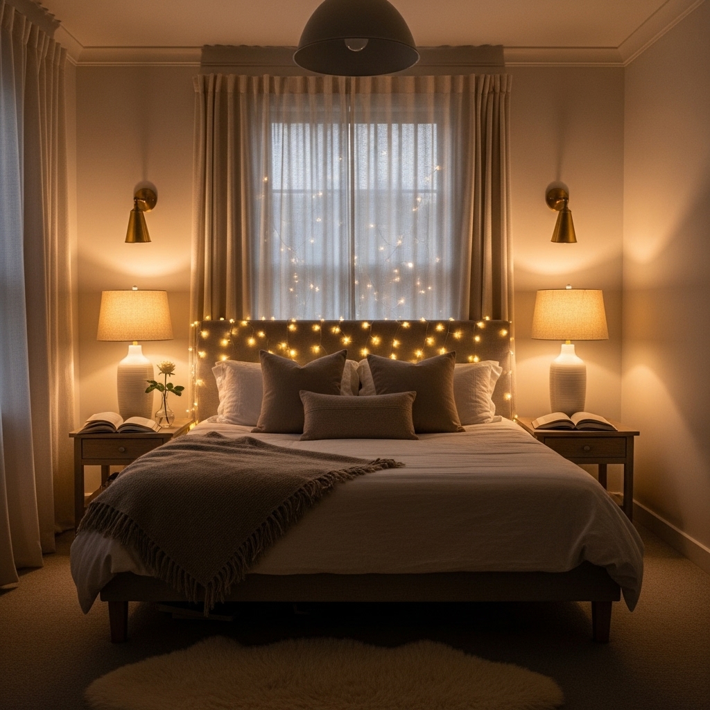 Lighting sets the mood. Replace harsh overhead fixtures with warm, soft lights. Use string lights, wall sconces, and bedside lamps with dimmers to adjust the ambiance as needed.