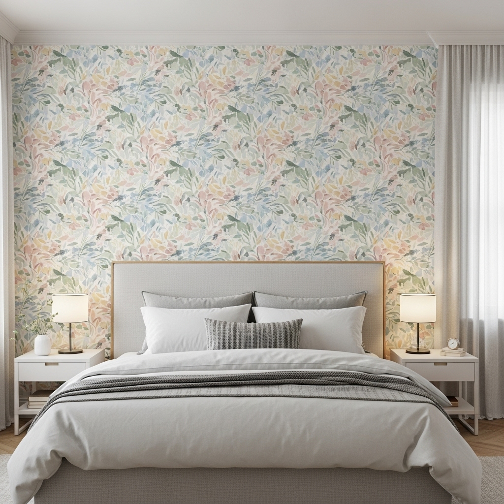 If painting isn’t your thing, try peel-and-stick wallpaper with romantic patterns — florals, damask, or soft watercolor designs. It’s renter-friendly and instantly transforms your bedroom into a serene retreat.