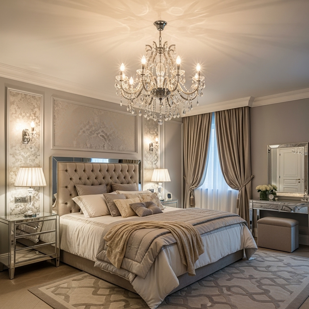 A chandelier or pendant light with crystals or rattan details becomes the crown jewel of your bedroom. Choose one that complements your style — whether boho, classic, or modern chic.