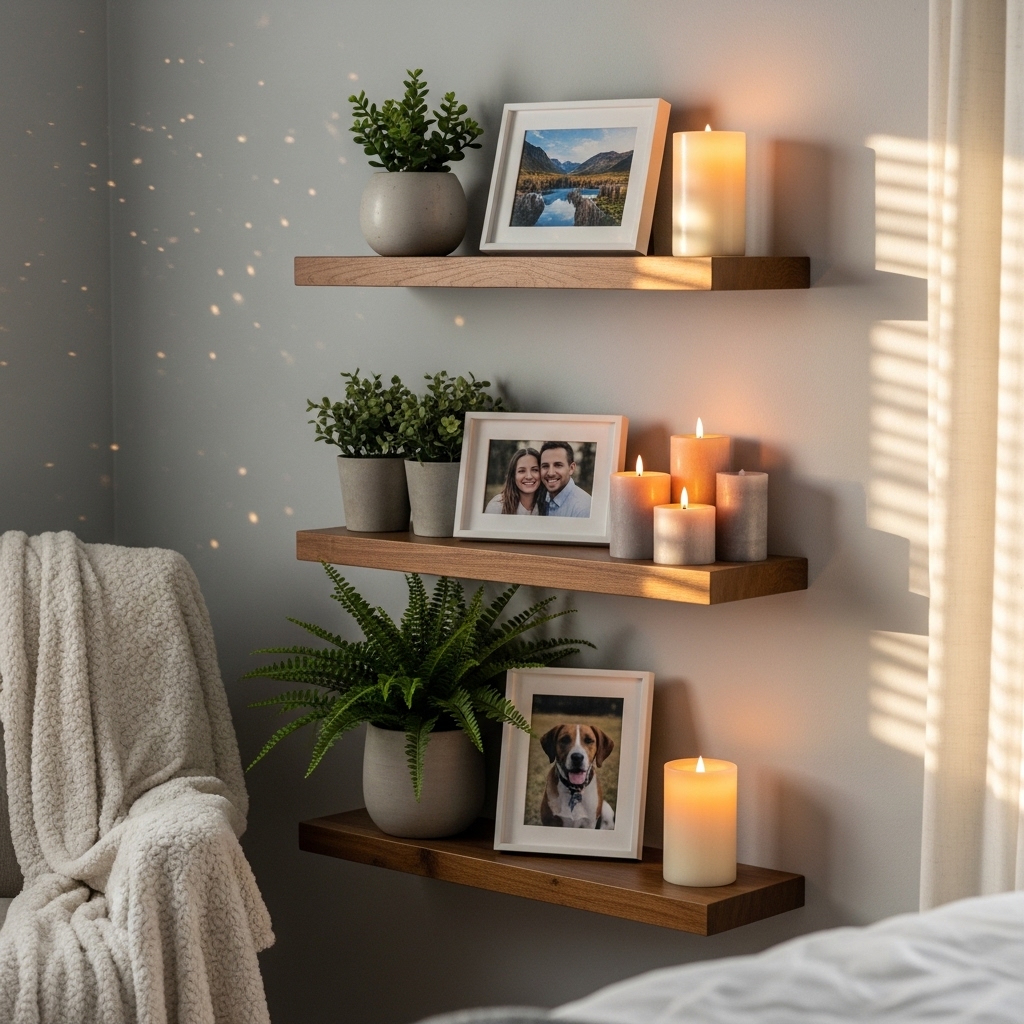 Floating shelves are perfect for displaying candles, plants, or framed photos without cluttering your surfaces. Arrange them symmetrically above your bed or along the wall for a balanced look.