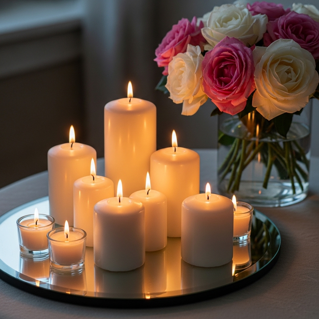 Group candles of varying heights on a mirrored tray or vintage platter. Light them in the evening to create a romantic, spa-like ambiance.