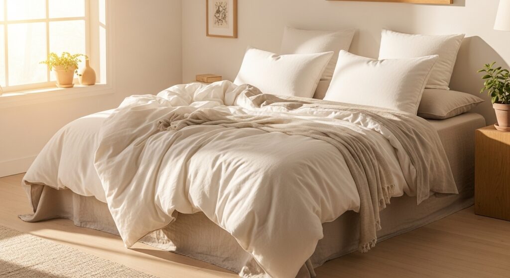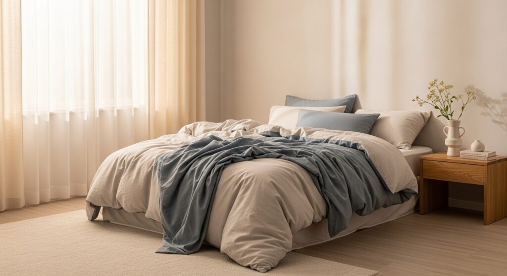 Quality bedding makes a big difference. Opt for cotton, linen, or flannel depending on the season. Breathable fabrics help regulate temperature.