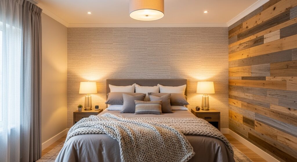 Shiplap, wallpaper, textured paint, or wood panels give depth and visual interest without overwhelming the space.