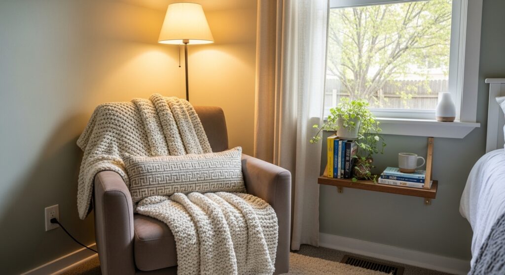 A small reading nook creates a personal getaway. Place a comfortable chair near the window with a throw blanket and small table.
