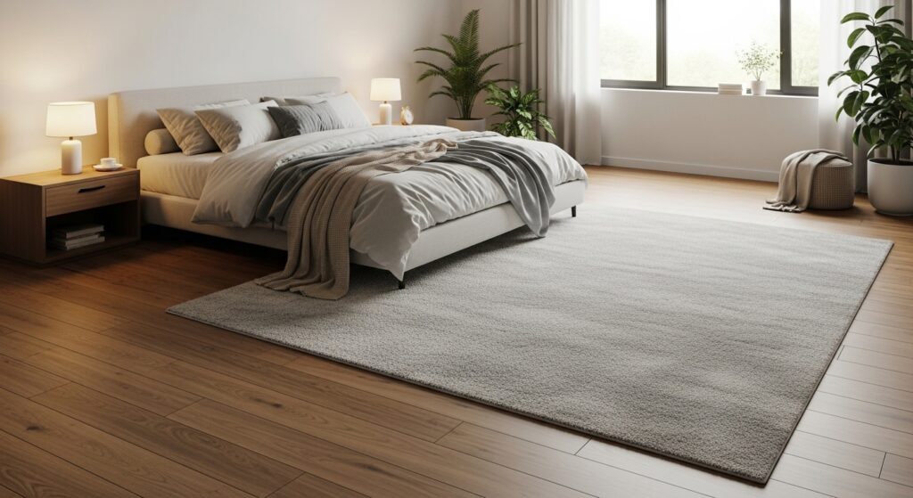 Rugs add softness underfoot and help frame the room. Even if you have carpet, layering a small rug beside the bed increases comfort and design depth.