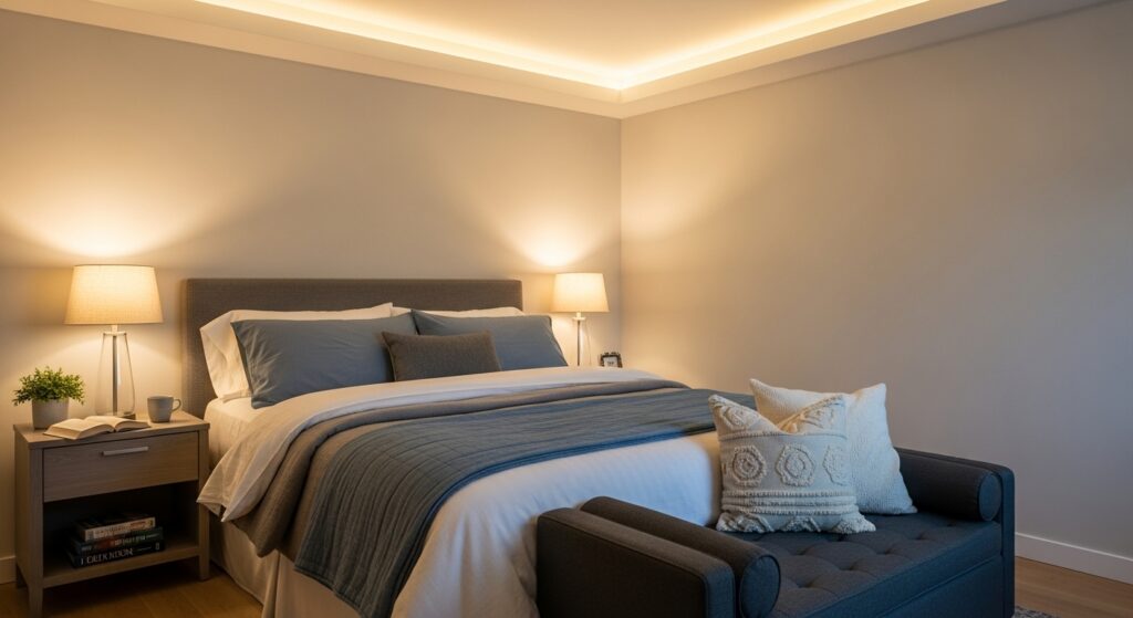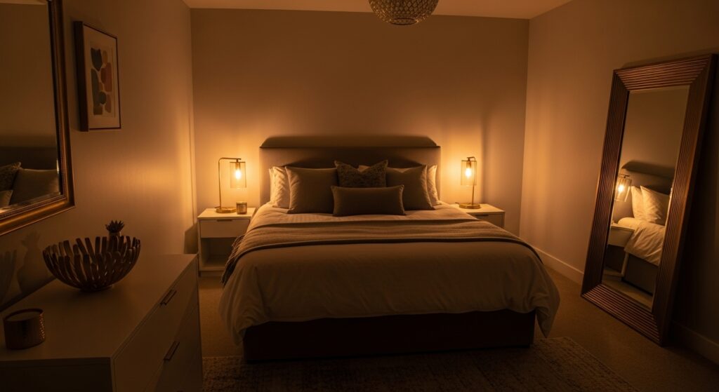 Lighting influences mood more than any other detail. Use warm bulbs, bedside lamps, lanterns, or string lights to create a gentle glow. Dimmer switches help you adjust the ambiance at night.