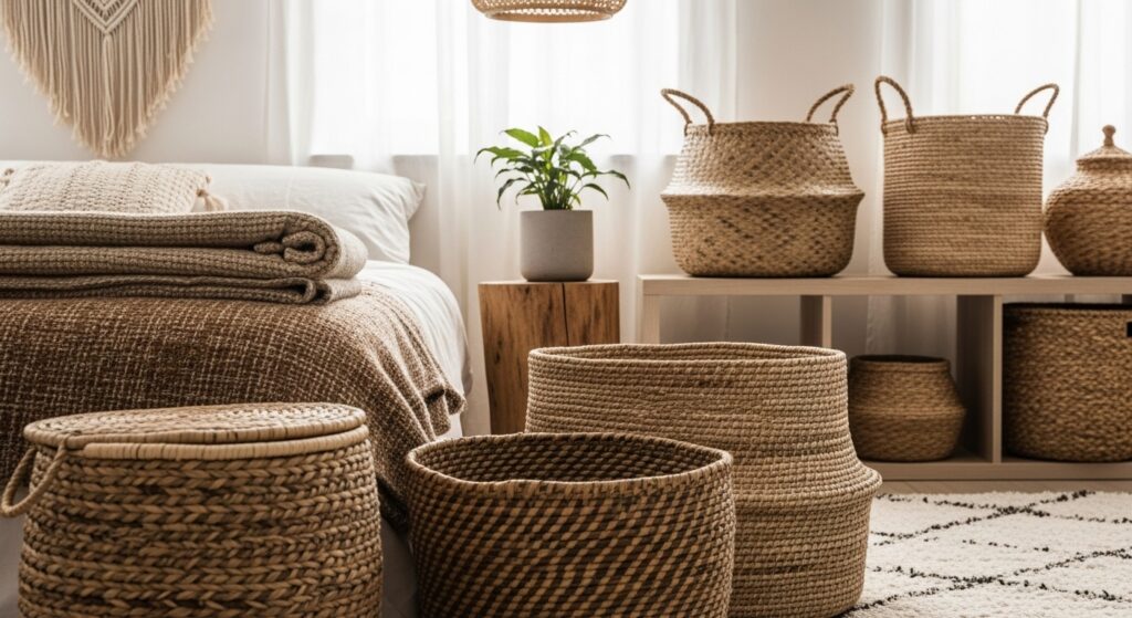 Baskets provide storage and texture. Use them for blankets, pillows, or small items you want nearby but not scattered.