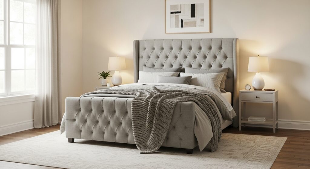 A bold headboard defines your style. Choose upholstered for softness, rattan for boho vibes, or reclaimed wood for character.