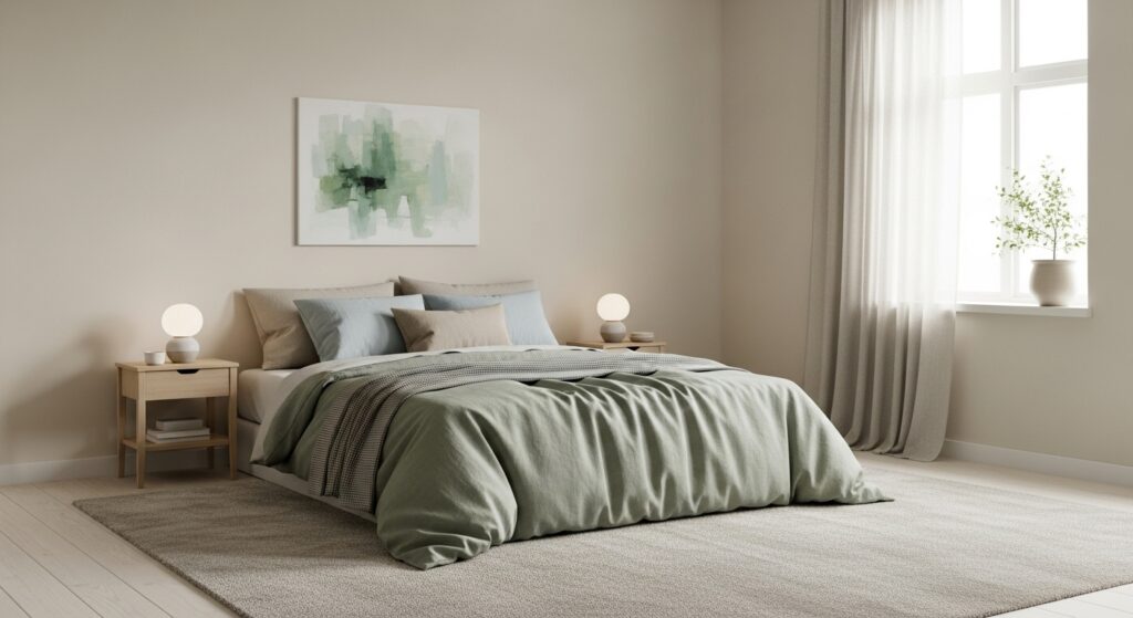 Soft neutrals, muted greens, warm beige, and dusty blues produce a quiet atmosphere. Avoid harsh contrasts to maintain the cozy feel.