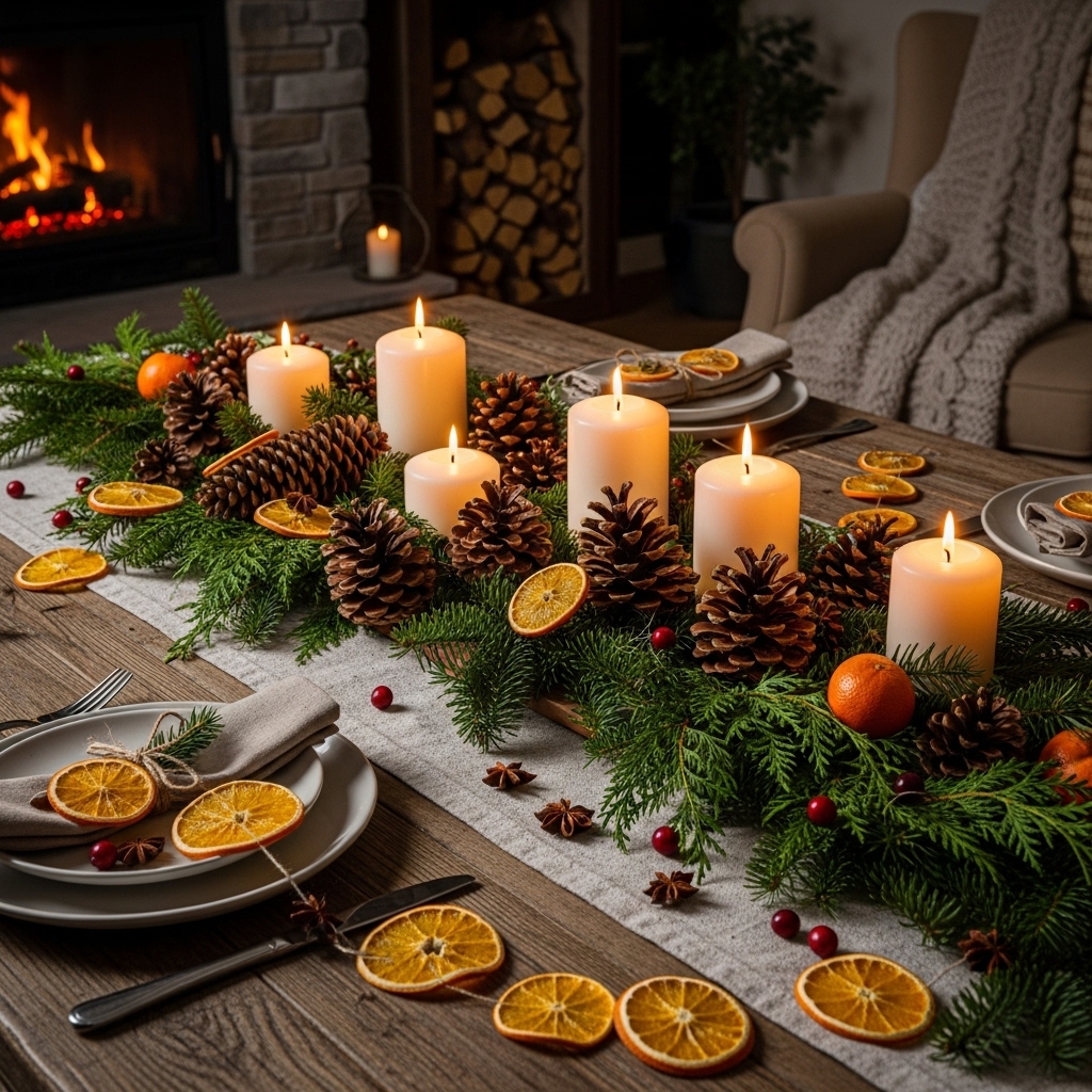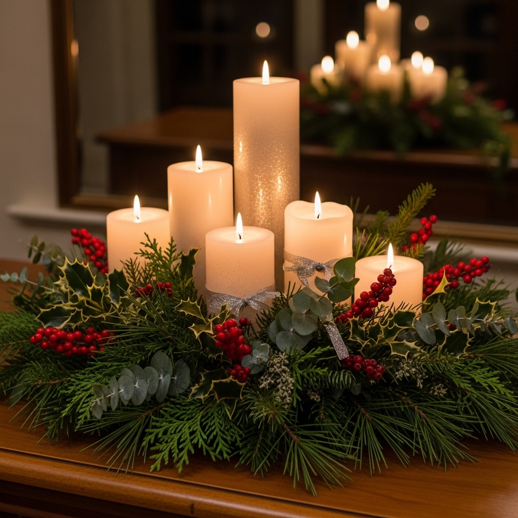 Candles instantly create a cozy, festive glow. Group them with greenery or berries for an elegant, low-cost display.