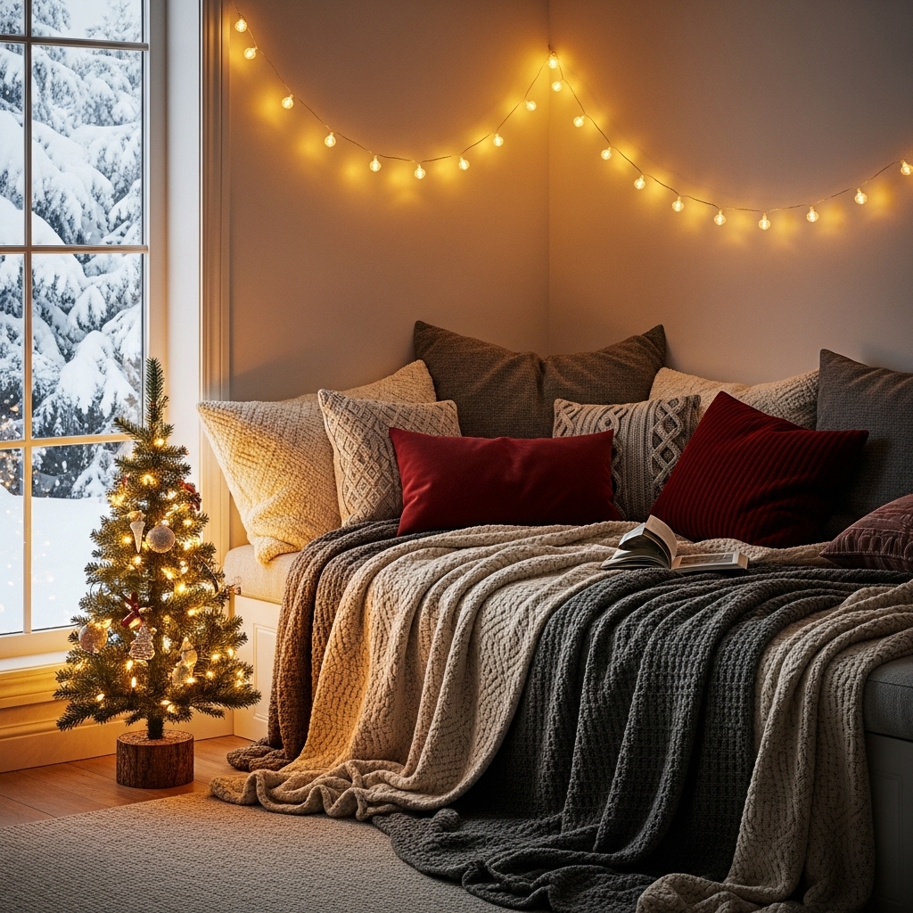 Drape blankets, hang string lights, and add a small tree or candle setup. It’s an affordable way to add holiday warmth to your space.