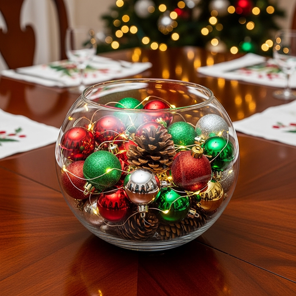 Fill a glass bowl with ornaments, pinecones, and fairy lights for a stunning centerpiece that costs almost nothing Christmas Budget Friendly Ideas.
