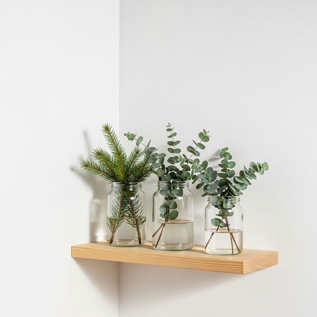 Small evergreen branches, eucalyptus, or pine sprigs tucked into jars or hung above the window frame bring life into your kitchen. A touch of greenery helps balance the cool tones of winter.