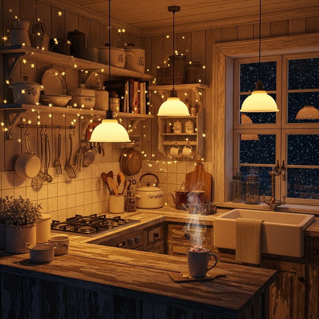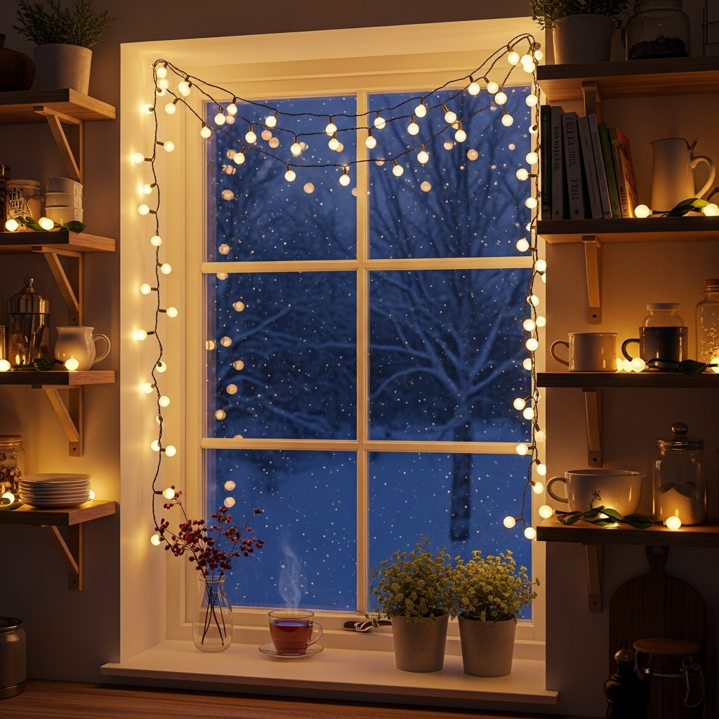 String lights instantly transform your kitchen. Drape them around windows or shelves for a soft winter glow that doubles as decor.