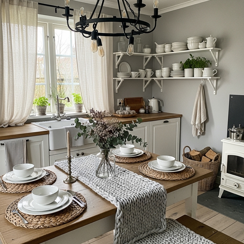 Use knitted placemats, linen napkins, and wool runners to bring texture and warmth to your kitchen surfaces. Textured fabrics make even a minimalist kitchen feel snug and seasonal.