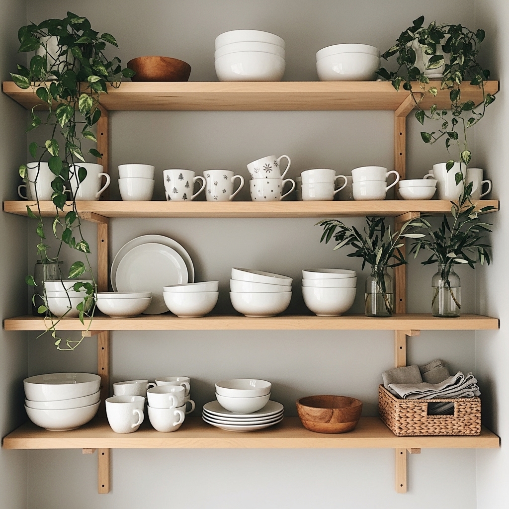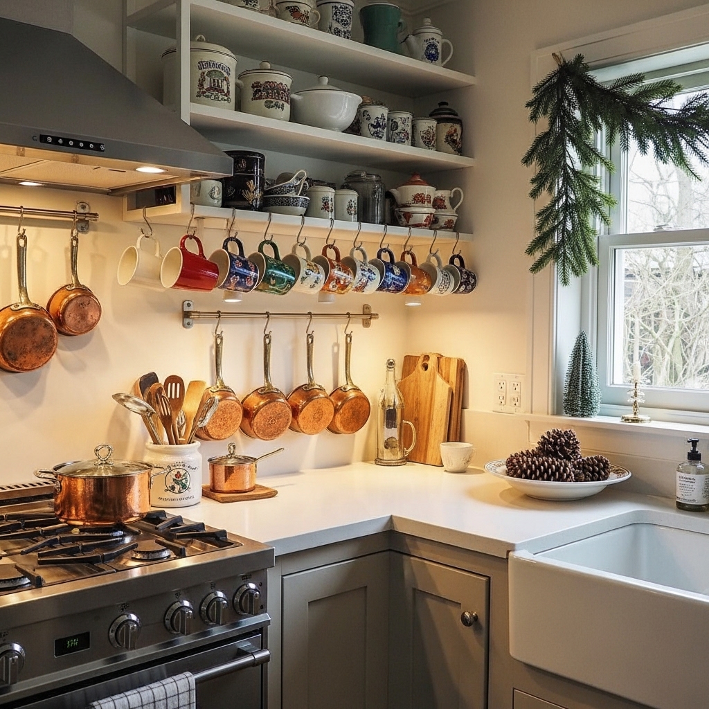 If you have open shelving, style it seasonally. Stack neutral mugs, display white ceramics, and add winter greenery for an effortlessly cozy look.