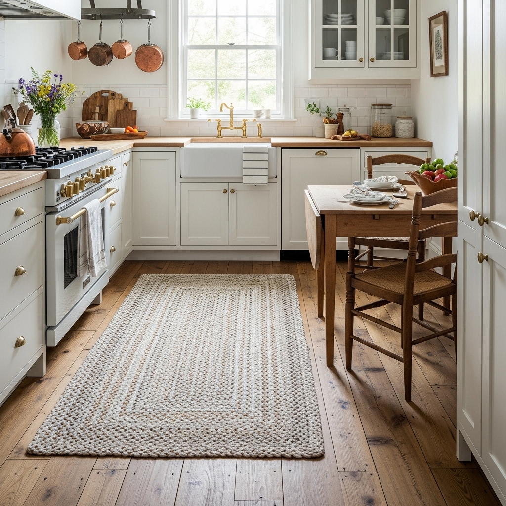 Replace plain kitchen mats with woven or braided rugs in earthy tones. They not only add comfort underfoot but also visually warm up tile or hardwood floors.