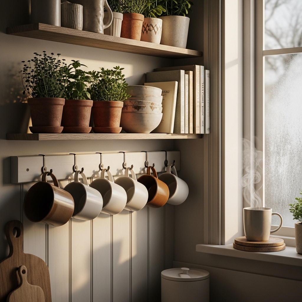 Mugs are both practical and decorative. Hang them from hooks or display them on a small open rack for an inviting, homey look.