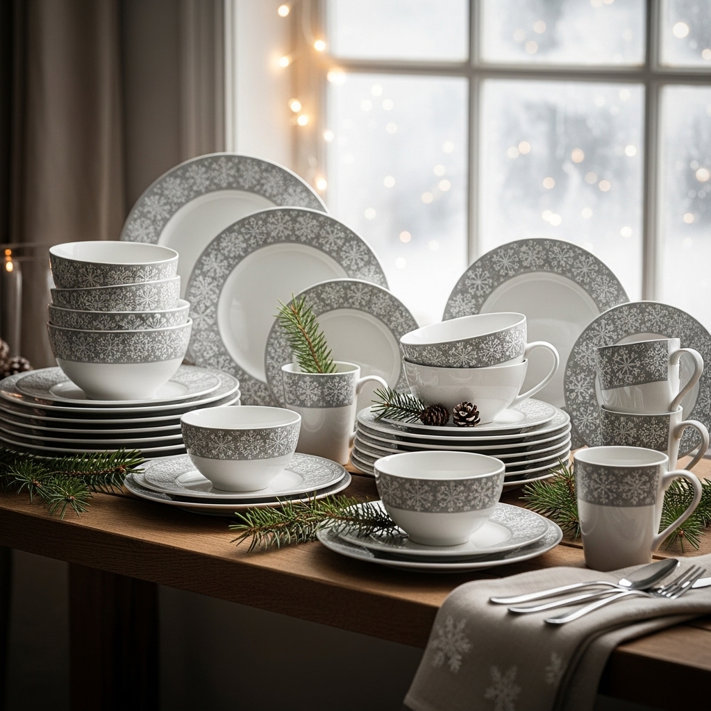 Pull out plates and bowls in whites, grays, or with subtle snowflake patterns. They make even a simple meal feel like a winter feast.