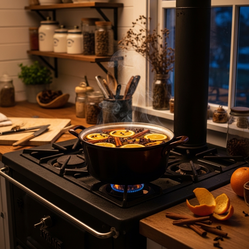 Use simmer pots filled with cinnamon sticks, oranges, and cloves. Not only do they make your kitchen smell amazing, but they also evoke the essence of winter comfort.