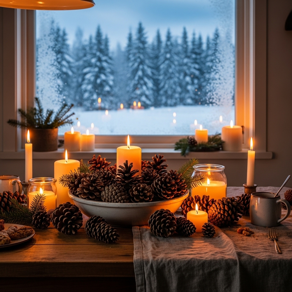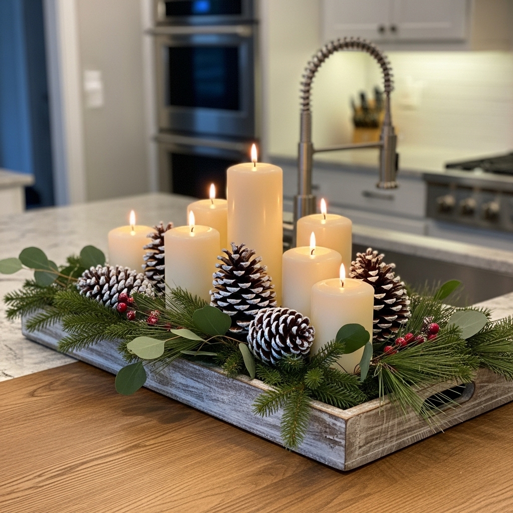 Even if you don’t have a dining table, a small kitchen island or counter tray can host a centerpiece with candles, pinecones, or greenery.
