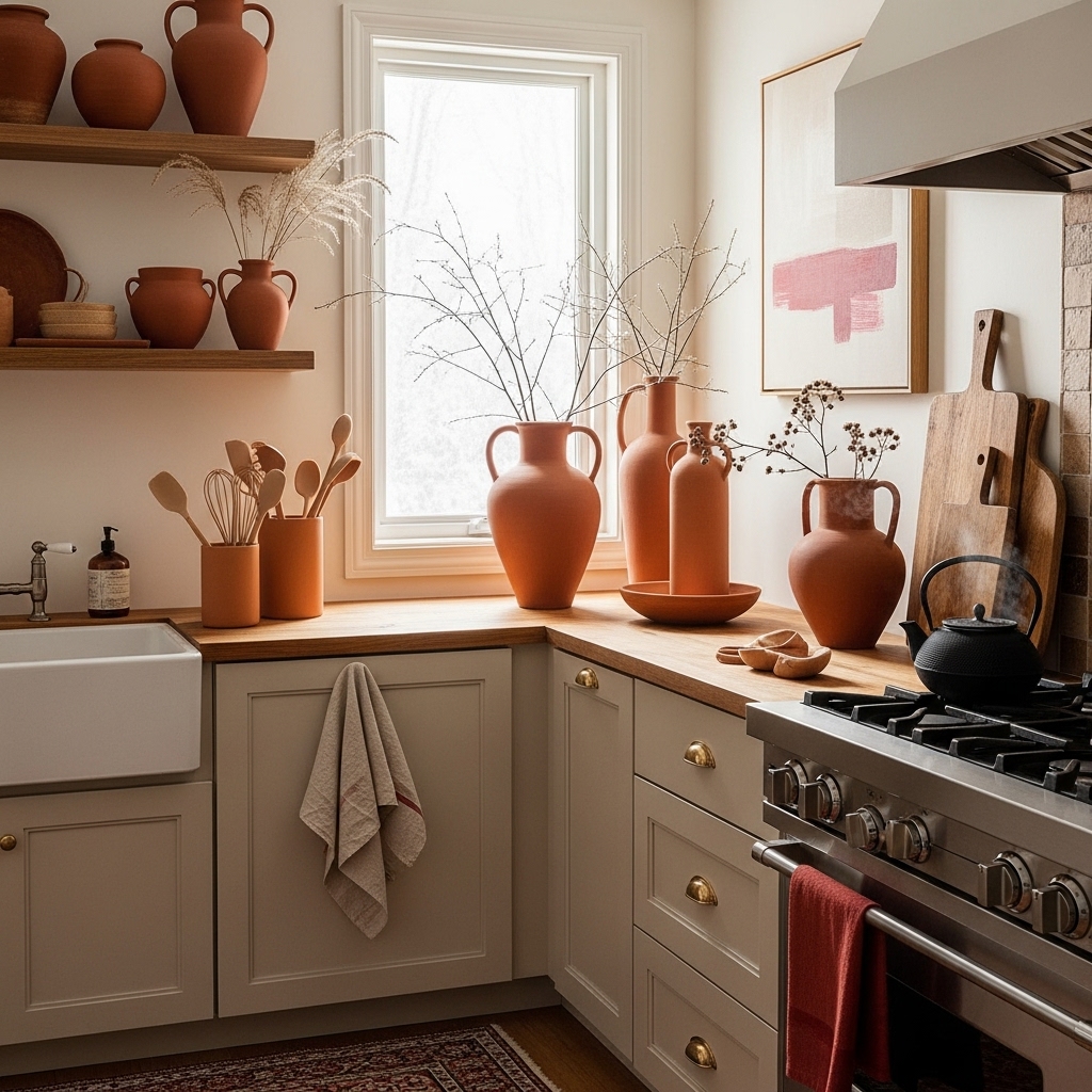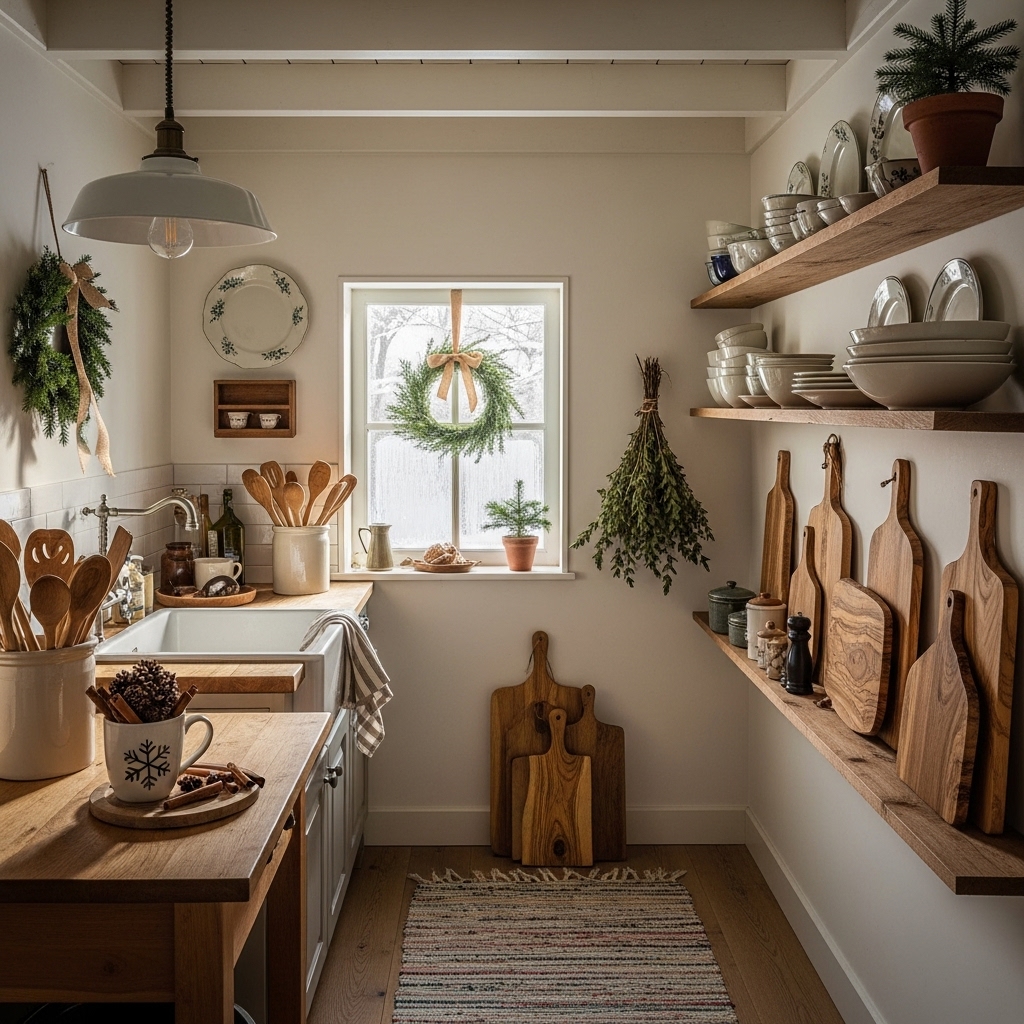 Wood adds organic warmth. A small cutting board display, wooden spoons, or rustic open shelving can ground the space and enhance the cozy cabin-like aesthetic.