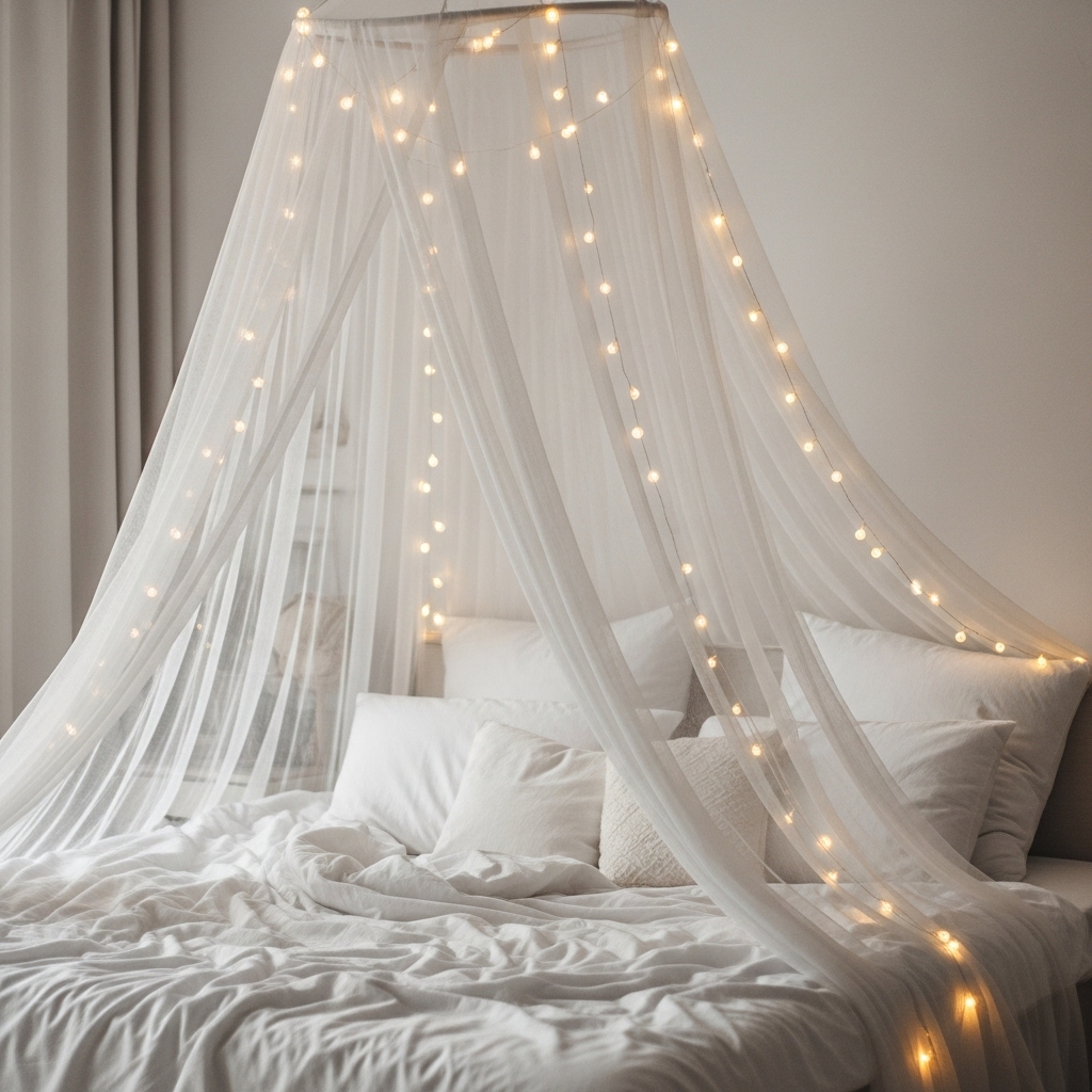 Add romance and softness by hanging sheer curtains from the ceiling to create a canopy around your bed.