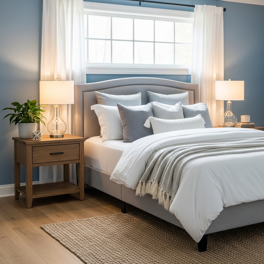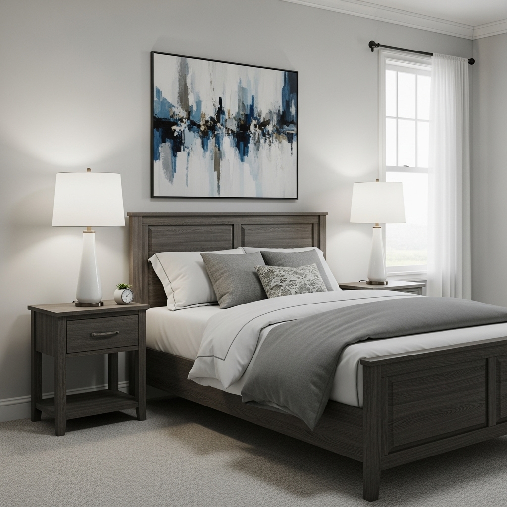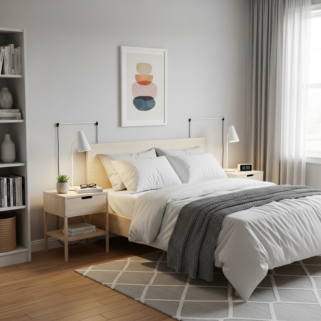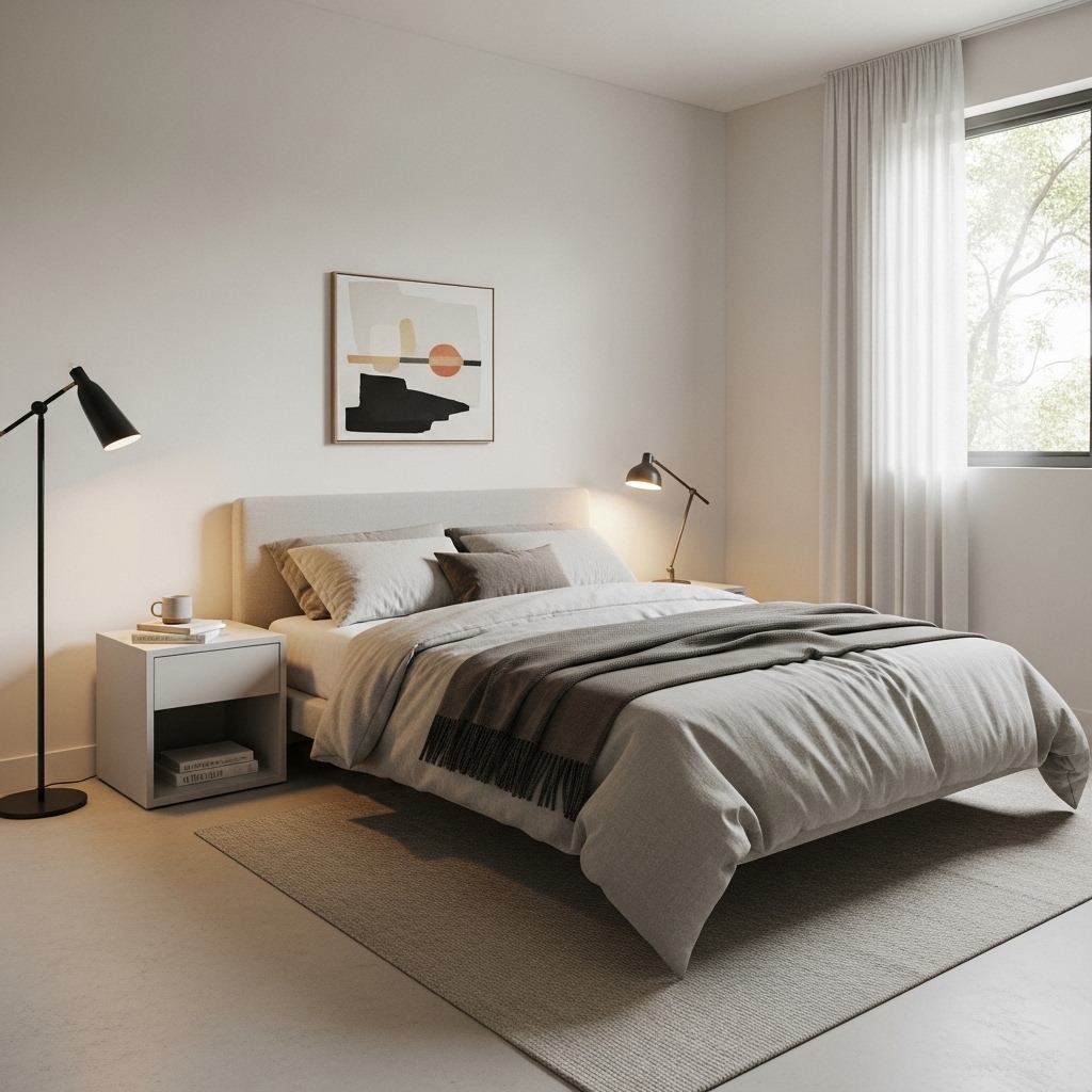 Balanced decor creates harmony. Matching bedside tables and lamps instantly make your room look polished and organized, enhancing the minimalist appeal.