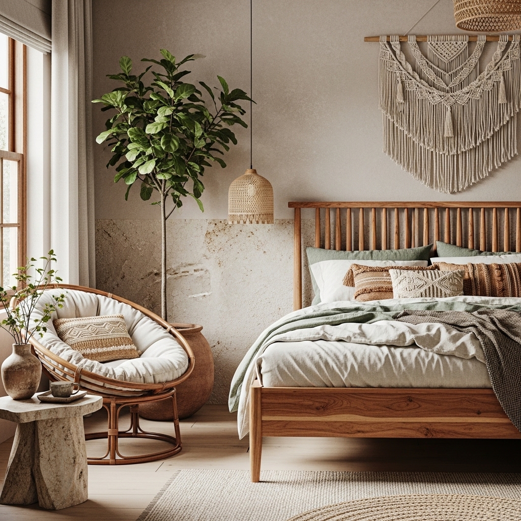 Wood, rattan, stone, and linen create a grounded, organic feel. Incorporate these materials in your headboard, nightstand, or decor accessories. Their natural tones and textures promote comfort and balance.