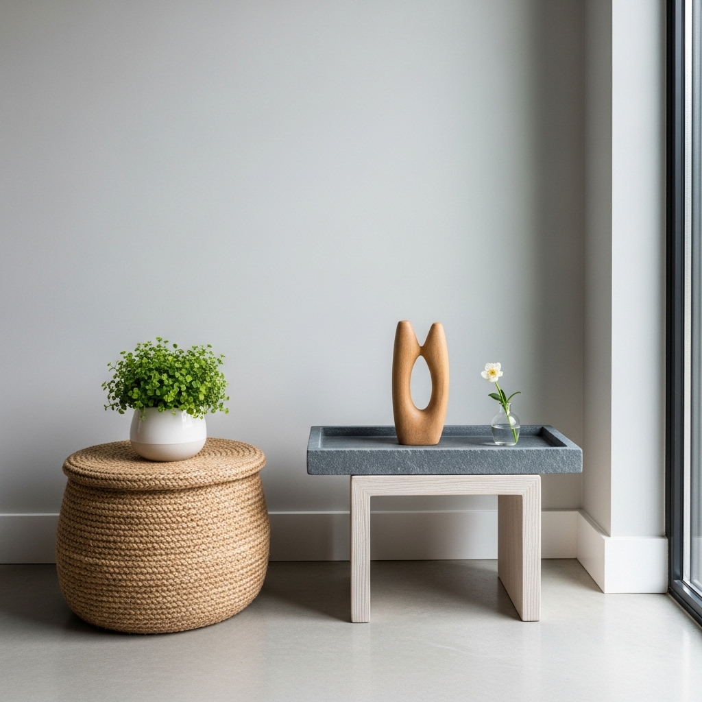A woven basket, a stone tray, or driftwood decor can subtly tie your design to nature, grounding your space with organic beauty.