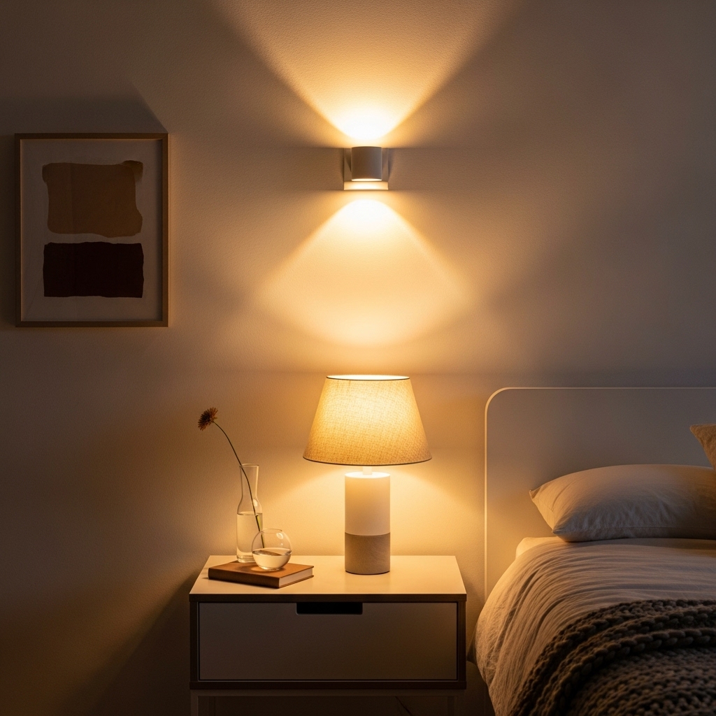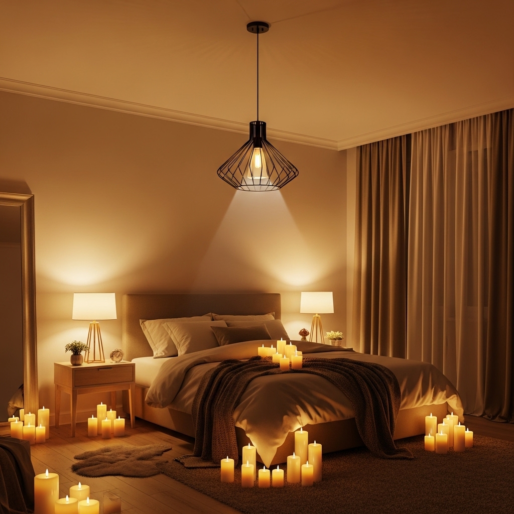 Combine overhead lighting, bedside lamps, and candles for a warm, layered glow that feels both minimal and comforting.