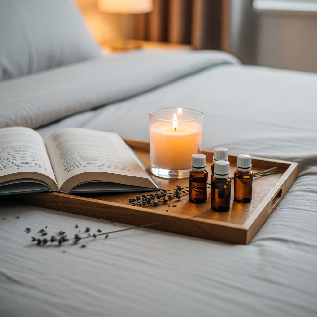 Dedicate a small area—a tray with a candle, a favorite book, and essential oils—to help you unwind before bed.