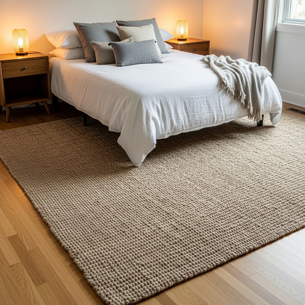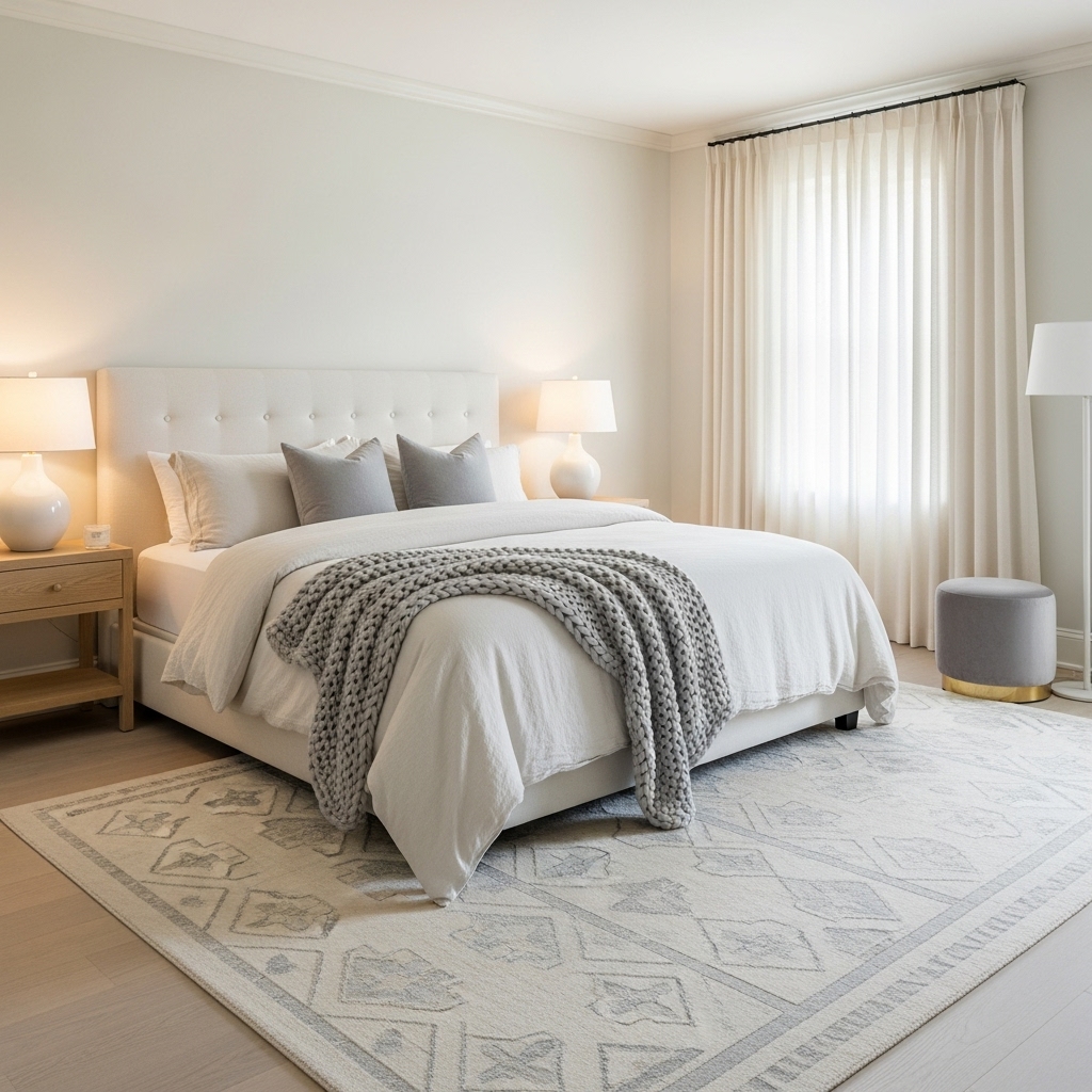 A neutral rug under the bed anchors the space and adds a soft layer underfoot. Go for woven jute, wool, or cotton textures to complement your minimalist aesthetic.