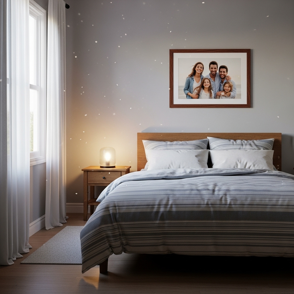 A minimalist bedroom doesn’t have to feel sterile. Include one or two personal touches—like a framed photo or meaningful memento—to make the space yours.